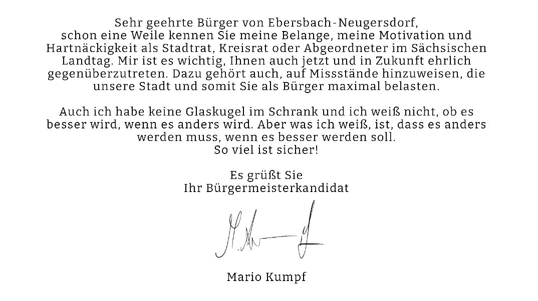 Mein Name ist Mario Kumpf, ich bin 1986 in Löbau geboren und lebe zusammen mit meiner Frau und meiner Tochter im Ortsteil Ebersbach in unserer Heimatstadt Ebersbach-Neugersdorf, der drittgrößten Stadt im Landkreis Görlitz.